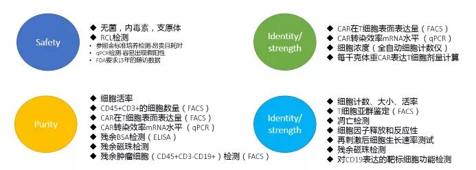 第一个上市的CAR-T药物Kymriah的释放标准涉及到多个方面的指标,下图是小编收集到的Kymriah的释放指标所需要测试的实验: