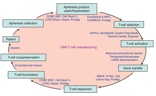 我们国家从去年开始接受了CAR-T的新药申报,目前已经有二十几家企业申报了CAR-T的临床试验,这意味着CAR-T的产业化发展迎来了春天,CAR-T的工艺研究也必将百花齐放。现在的CAR-T工艺(图1),大体流程都是从患者体内的采血,把血样运输到生产的GMP中心,进行细胞的激活,慢病毒转染以及细胞的扩增、最终制剂生产和质量放行,最后再回到医院回输给患者。CAR-T作为一个全新的,革命性的技术正处于飞速发展阶段,不断有新的思路及新的技术进入该领域,人们对它的科学认识也在不断深入,随着CAR-T的制备工艺的提高,对它制备过程风险及质量控制要求也在不断加强。