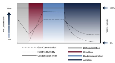 干法移动式过氧化氢灭菌的特点主要体现在“干”上面,“干”是指干的工艺(图6),能使液态过氧化氢完全气化,并实时监控灭菌区域的相对湿度,严格控制在饱和湿度值以下,避免过氧化氢在物体表面结露,大大降低腐蚀的风险,并有广谱的生物学效应,对细菌孢子、繁殖体、病毒、真菌、支原体等都能达到6log无菌保证水平。移动式主要体现在它的灵活性上,它既可以通过组合的方式对大空间进行一次性灭菌,又可以通过单台灭菌系统对不同的细胞制备核心功能区进行一对一灭菌,而不影响相邻功能区的正常使用。