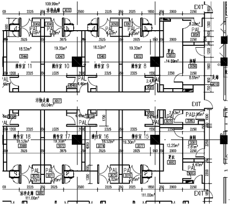 下图(图7)是某CAR-T制备机构的布局图(局部),该机构制备功能区由11组空调系统控制,功能性房间多达70多间,每个功能性房间面积大概20㎡,且相互独立,并且有70多套净化传递窗。对于功能性房间灭菌,不要求一次性灭菌,可以独立的分开灭菌,灭菌频次每个月1到2次;对于净化传递窗,可能需要一次性灭5-6台,几乎每天都会灭菌;基于这样的需求,该机构采用三套干法移动式过氧化氢灭菌系统,每套系统可以同时对相邻两组净化传递窗(图8)进行灭菌,三套干法移动式过氧化氢灭菌系统在45分钟内可以一次性灭6组净化传递窗,同样,三套干法移动式过氧化氢灭菌系统移动到各功能区可以一次性灭三个相互独立的不同功能性房间,大大提高了过氧化氢灭菌系统的使用效率,降低了购买设备的成本。