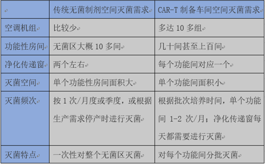 与传统无菌制剂空间灭菌相比,CAR-T制备车间对无菌要求会更高,所有的核心操作区均要求B+A的环境,其对空间灭菌需求有其自身的特点(图2):