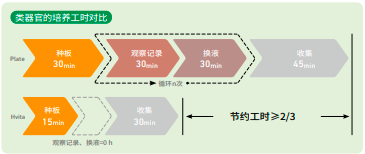 在 Hvita 系统内接种、换液、收集均只需一步操作,省去了逐孔种板、 换液、收集的重复机械操作。Hvita 培养舱可与显微镜模块搭配使用,免去了将样本从培养箱内取出进行观察、拍照记录的操作步骤。随着培养周期的延长、观察和换液频次的提高,Hvita 进行标准化培养的优势会越来越明显。