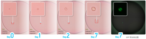 Castor X1可以对AAV病毒转导携带GFP表达基因的293细胞进行单克隆源性的鉴定和细胞GFP表达分析,可以识别出单细胞来源且成功转导表达GFP荧光蛋白的细胞样本孔。从而协助研发人员快速筛选出符合条件的单克隆细胞株,加快细胞株构建的研发进度。
